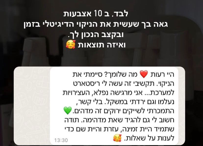 הניקוי פתוח עבורך למשך שנה שלמה, כך שתוכלי לחזור עליו במהלך השנה ולהנות מהתכנים את ספר המתכונים והתפריטים ניתן להוריד כקובץ כך שנשאר עבורך לתמיד
