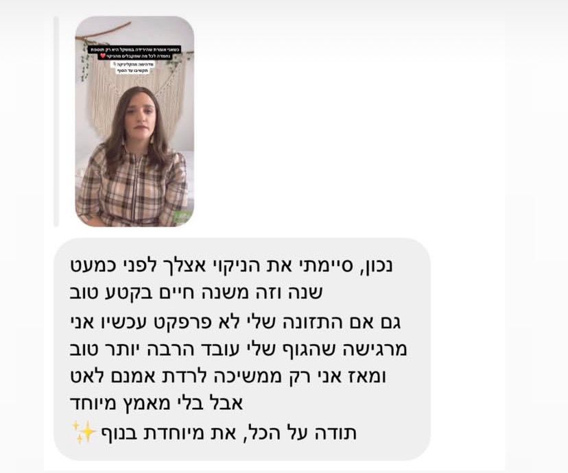 ✔️ אפליקציה עם סרטון יומי והנחייה שלי בכל יום כך שתטמיעי את השינוי לאורך זמן.